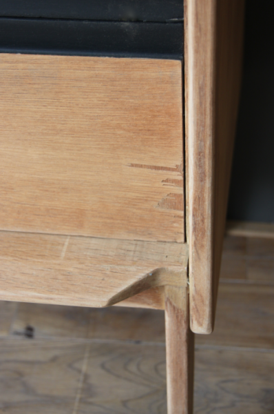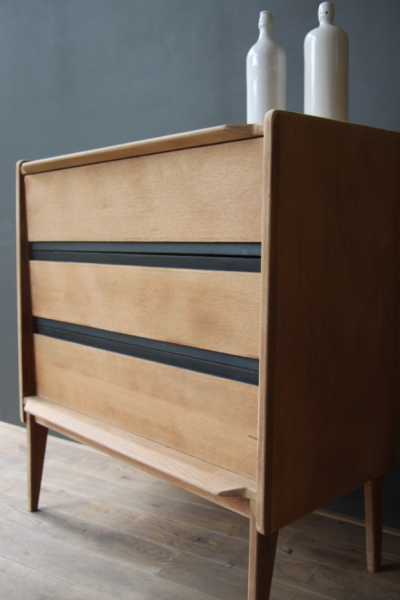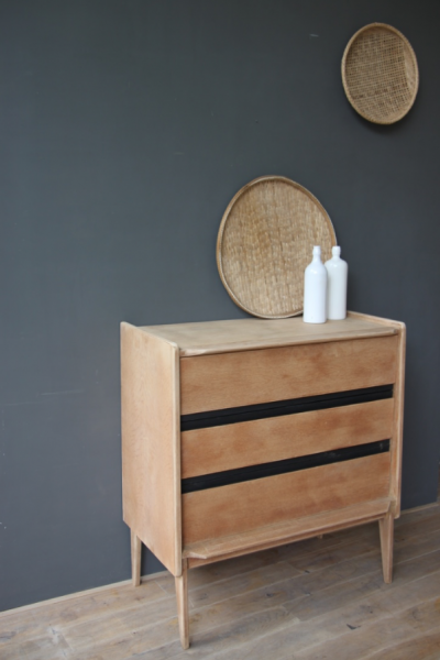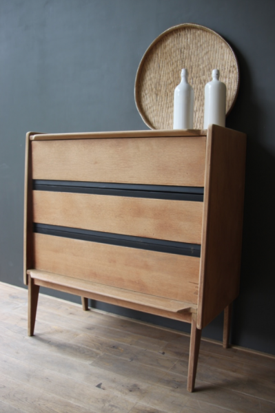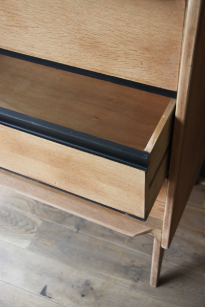 Commode années 50 dont la structure est en chêne - à l’origine vernie, elle a été poncée. Les tranche des tiroirs étaient peintes en noir à l’origine et ont été rafraîchies avec de la peinture noire.
