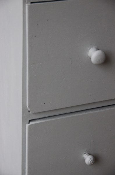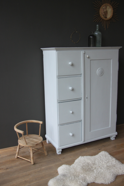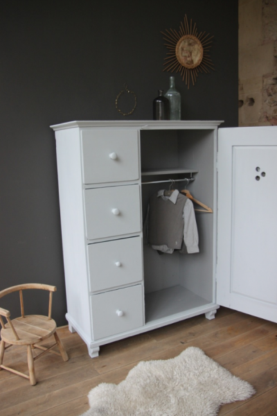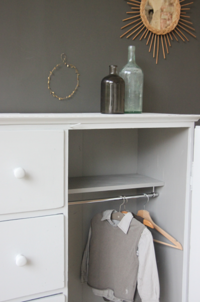 Ancien farinier transformé en petite penderie + commode pour une chambre d’enfant.