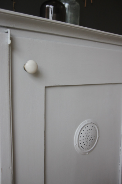Ces meubles servaient à entreposer la farine (une aération en metal orne la porte). Les fariniers ont la particularité que la porte vient chevaucher les tiroirs : les tiroirs sont maintenus fermés par la porte.