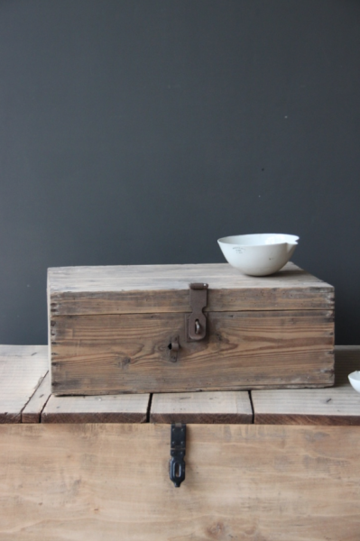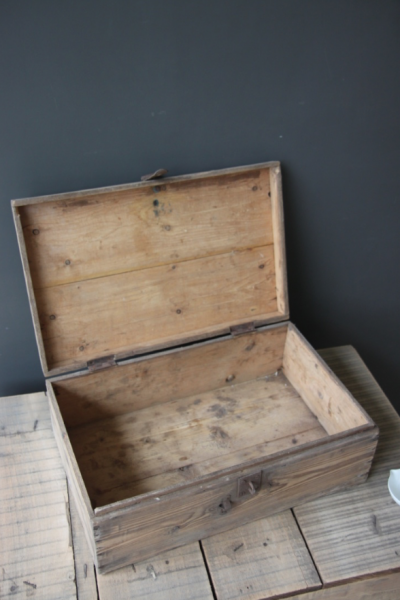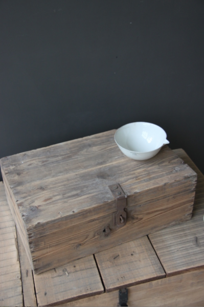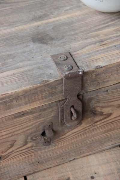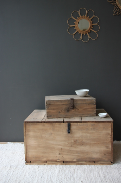 Ancienne malle ayant été poncée et laissée brute. Les fermoirs sont en metal qui a des traces du temps