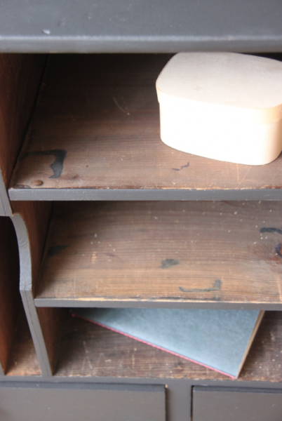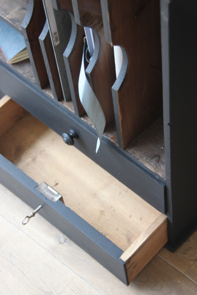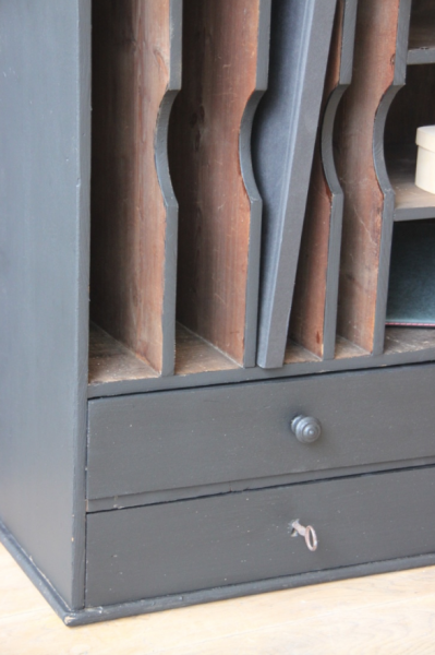 Petit meuble de rangement pour bureau à poser sur une table de travail par exemple. Composé de tiroirs et de range documents ce meuble d’aspect assez brut est plein de charme. Des taches sont à noter et les clés ne ferment plus (décoratives)