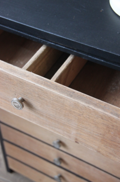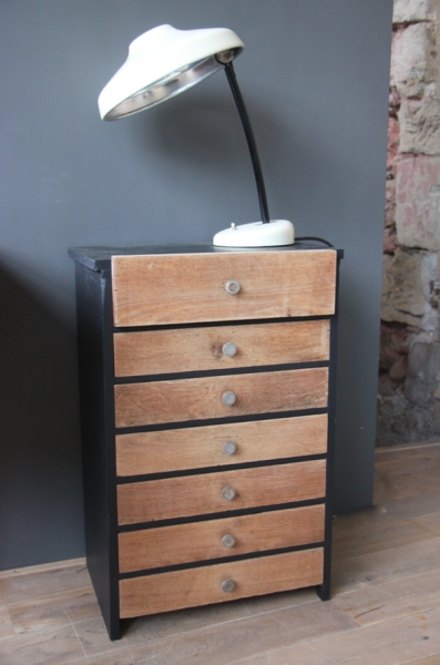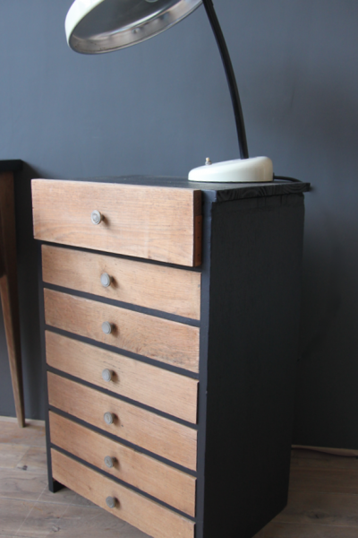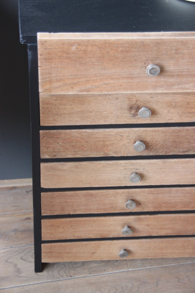 Meuble de bureau multi tiroirs en chêne. La structure a été peinte en noir et les tiroirs laissés bruts (le tiroir du haut est compartimenté)