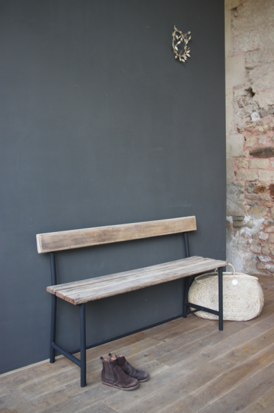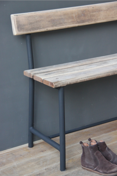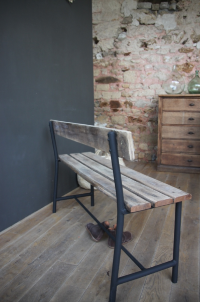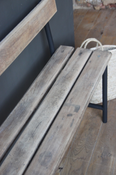 Banc en metal et bois. Le bois a été décapé de son vernis d’origine et le piétement peint en noir mat.