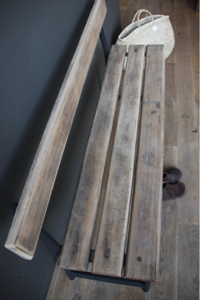 A noter : des tâches et traces sur le bois qui font partie du charme de ce banc qui trouvera sa place dans une entrée ou dans une cuisine.
