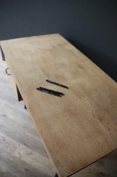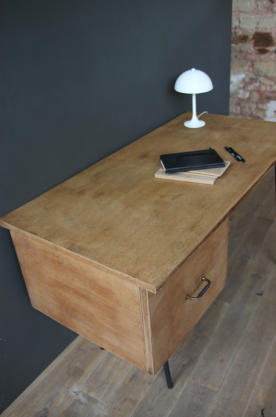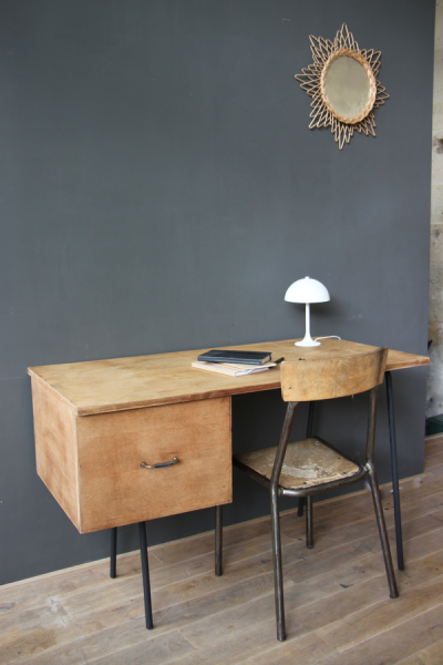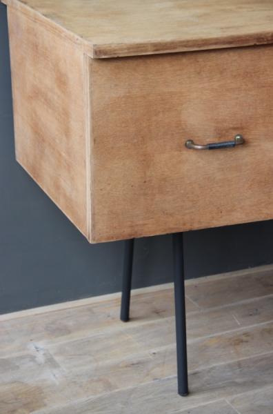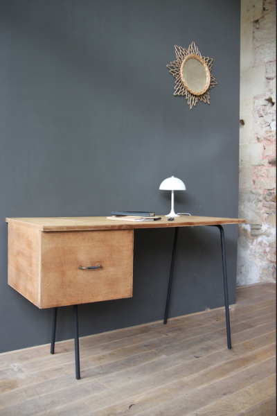 Bureau vintage pieds compas en metal noir. Les pieds ont été repeints en peinture noire mat. Son tiroir d’une grande contenance permettra de garder son bureau bien rangé.