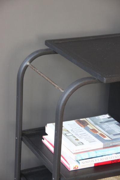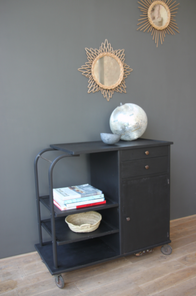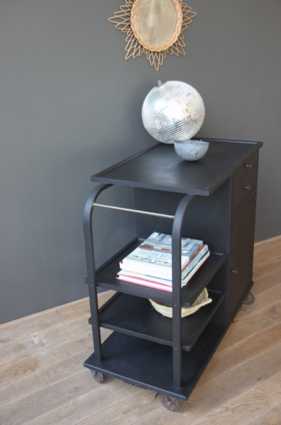 Ancienne desserte provenant d’un ancien café, le placard était réfrigéré.. Les roues ont été huilées et roulent. Le placard réfrigéré ne fonctionne plus bien que les fils et branchement anciens existent toujours sous le meuble.