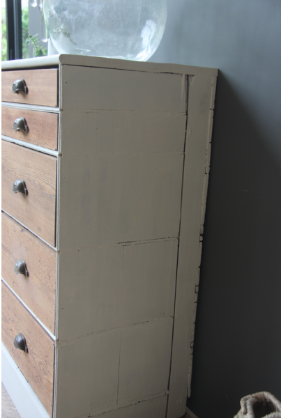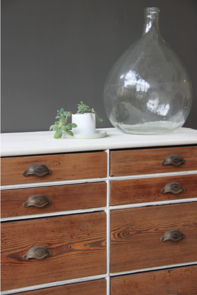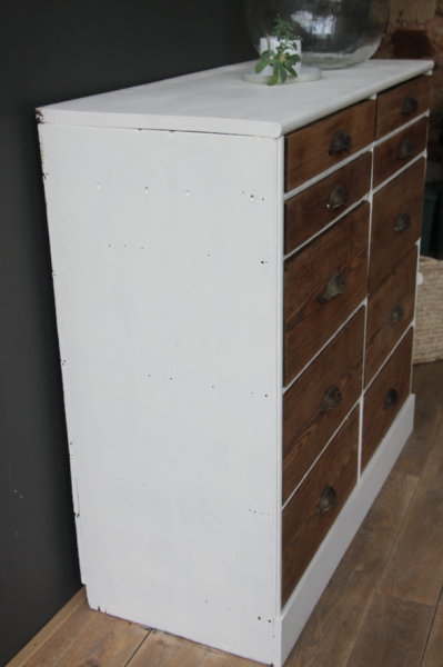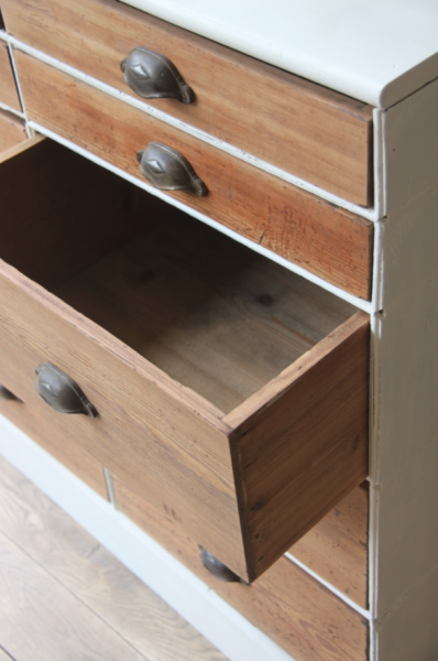 Ancien meuble de métier dont la structure a été peinte en blanc et les tiroirs poncés sont restés bruts.