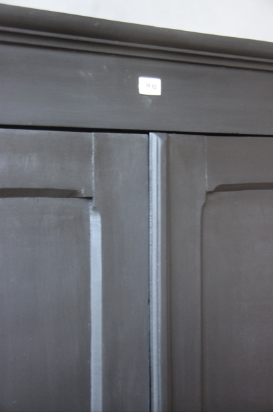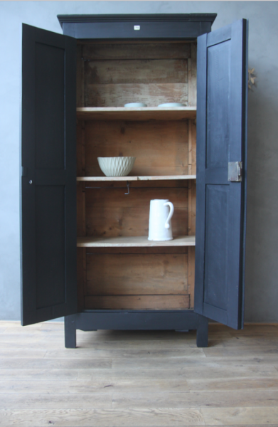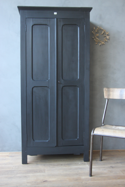Petite armoire en bois massif ayant été patinée en noir. Elle sera charmante dans une pièce à vivre pour ranger la vaisselle ou encore dans une chambre. L’intérieur a été laissé brut car il est en bon état et se marie joliment avec la patine noire