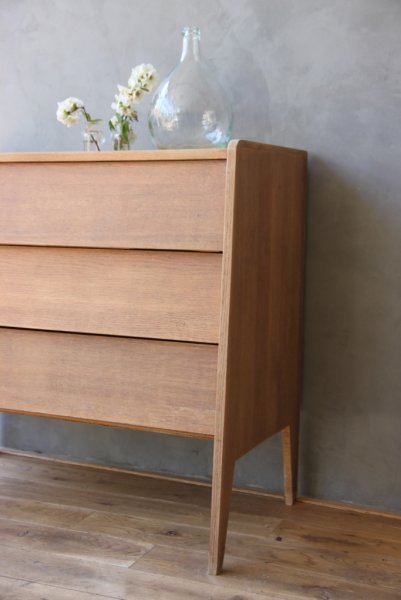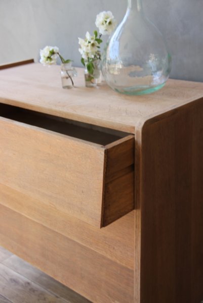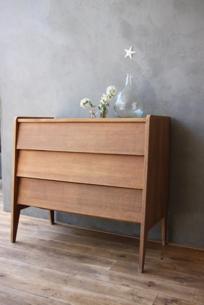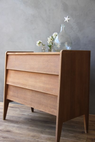 Rare et délicate commode vintage qui elle n’a pas de poignées (les tiroirs s’ouvrent par en dessous). Sa ligne sobre est très élégante !