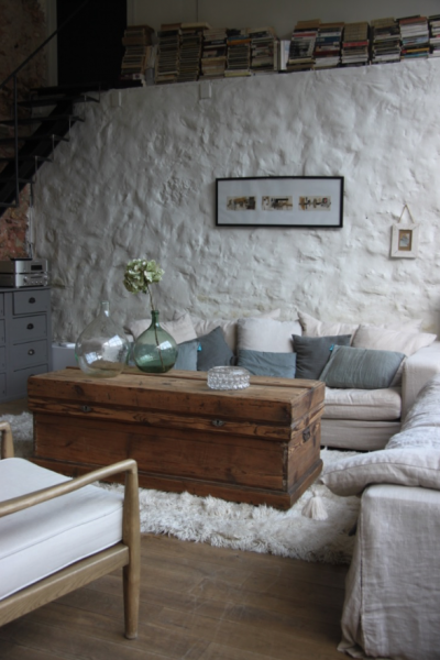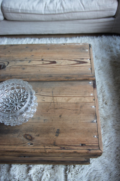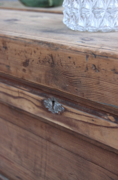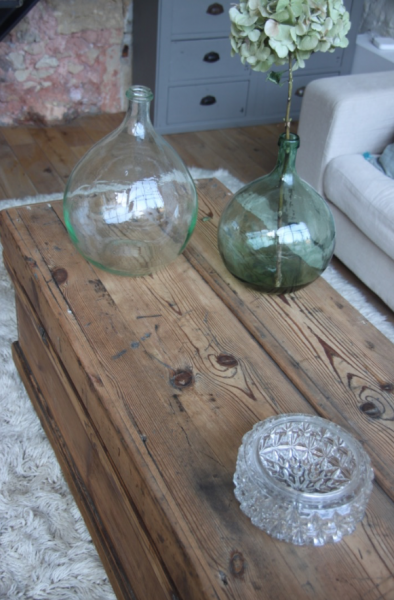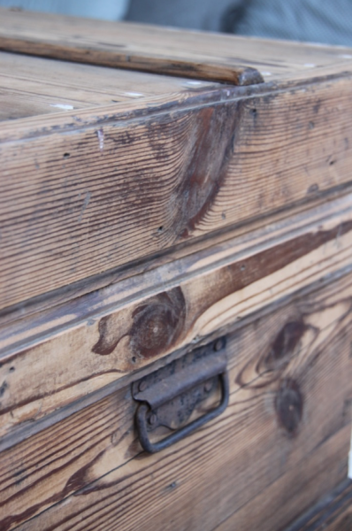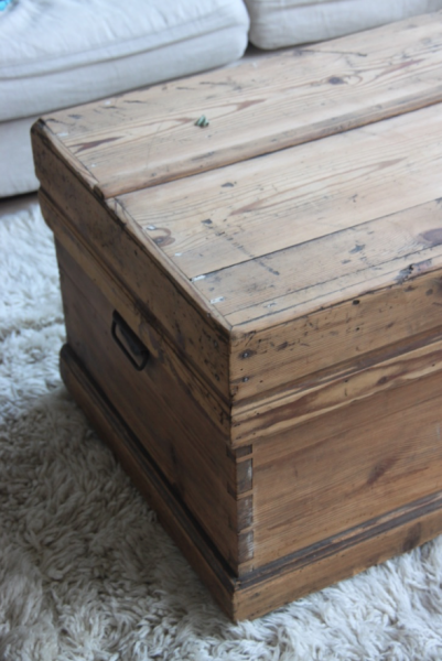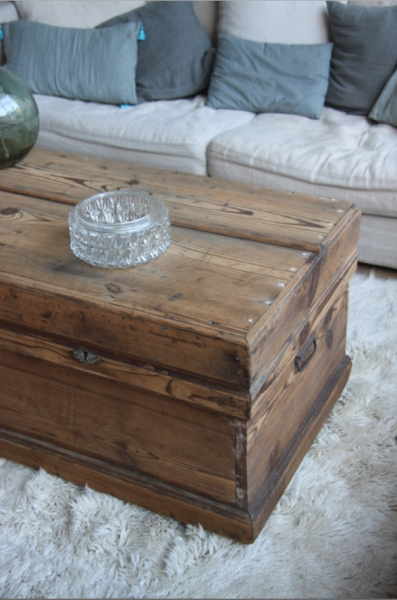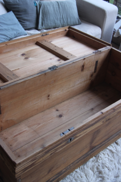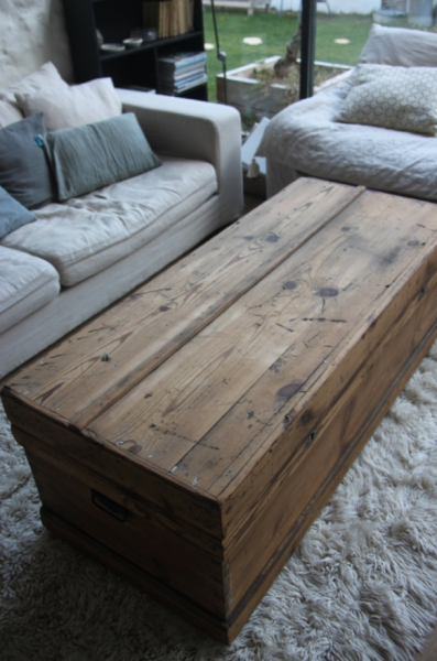 Très grande malle qui a été poncée et montée sur roulettes pour faciliter les déplacements... cette malle pourra soit être mise en pied de lit soit être utilisée comme table basse (avec la place pour un très grand bar !)
